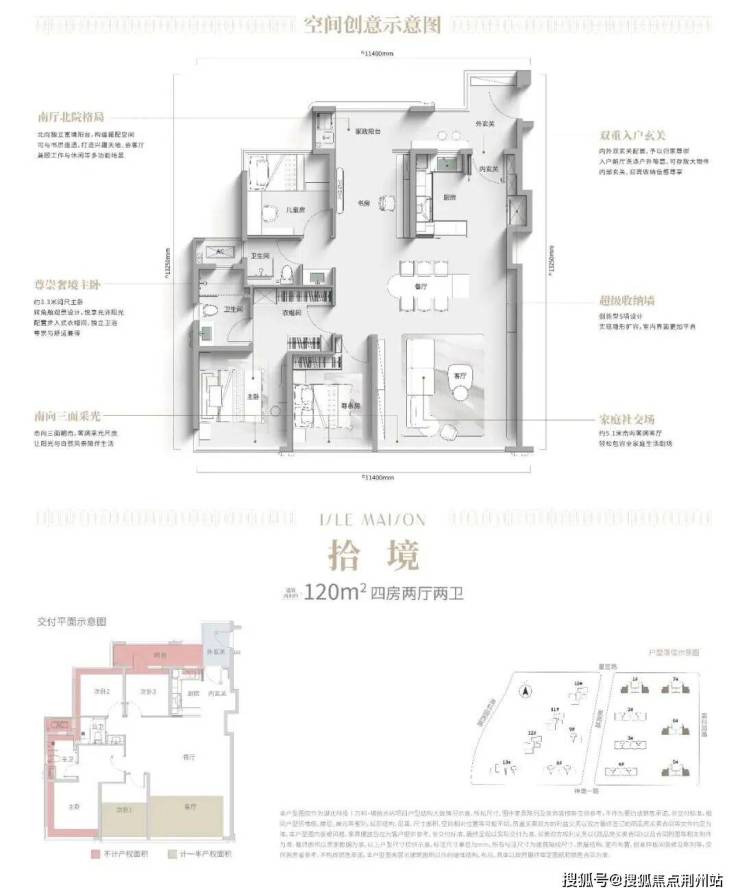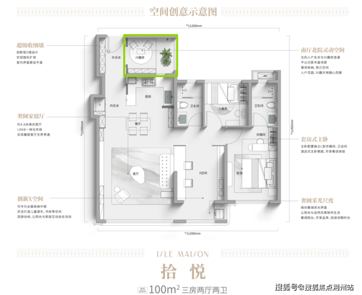 这是把过去高改甚至豪宅才能拥有的生活方式融入到建面约120平的户型内,联动整个动区南向客厅+双联阳台,就形成了一个南厅北院的格局。