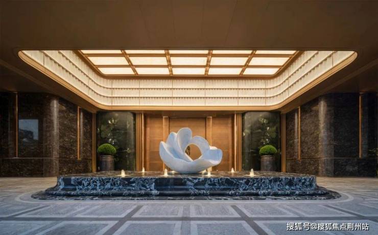 步入门庭,云石吊顶之下,借鉴中国古代建筑中的“藻井”做法,由522片皇家白玉石材拼接而成,凝聚光华,辉映时空。华光之下,中心水池承托起艺术雕塑,莹润皎洁,宛若珍宝。立面则采用铂金钻奢石,搭配墨绿荷塘月色奢石、安哥拉黑奢石花钵、以及手工锻造的巨幅铜门,流淌出一抹温润质感。