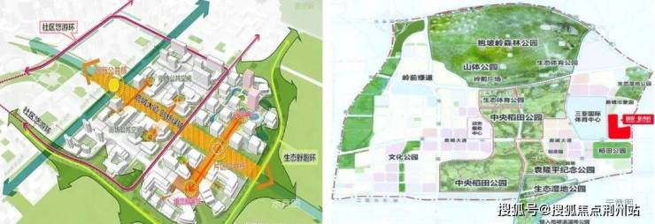 【一园】中央稻田公园为核心开放空间及中央轴心,政务组团、文化中心、体育中心等环绕