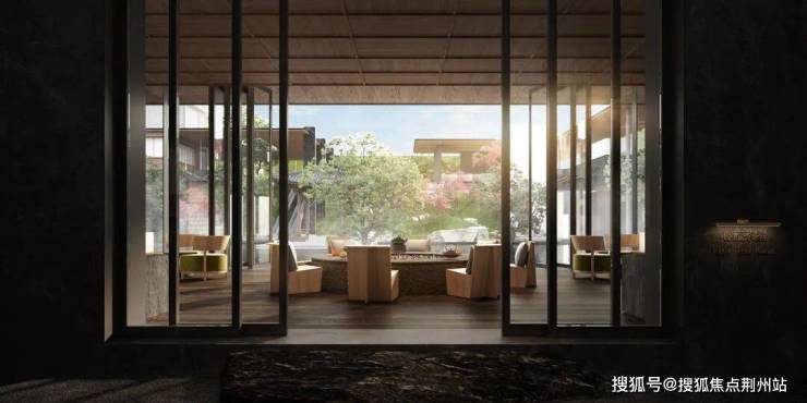 【心流盒子】:整个茶室空间由木材质进行包裹,天花木格栅造型延伸至墙面,打造出立于庭院旁的独特“木质盒子”。推开茶室折叠门,中心庭院的景观一览无余,示范区旖旎风光亦能尽收眼底。