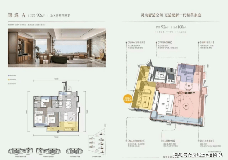 100㎡三房两厅两卫(规划计容面积约92㎡--锦逸):此户型分布在1/2/3/4/5/7/8/9号楼18层布局的中间户型,北向常见连廊结构连接;三开间朝南、动静分区设计;大开间小进深,即宽(开间)约11米,深(进深)约9.8米;客厅开间约4.8米、S墙设计预留冰箱镶嵌及鞋柜等位收纳位置;阳台开间约7.8米,拥有约18㎡主卧套间;