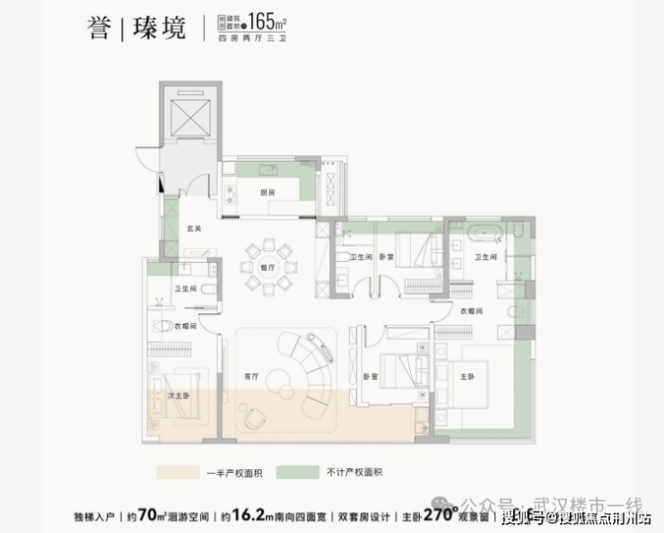 建面约165㎡四房,南向面宽可达约16.2m,主卧有270°观景,双套房设计,还有很多赠送的空间。
