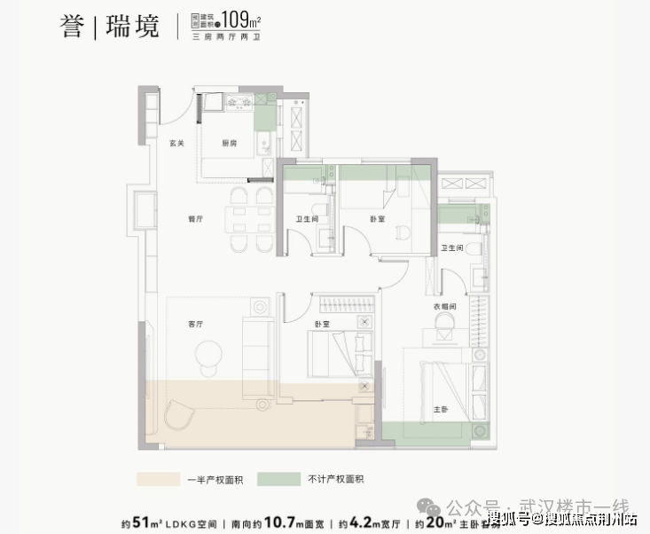 建面约109㎡三房,连廊中间户,算是比较常规的户型了,不过每个房间空间都很大,主卧都有约20平。