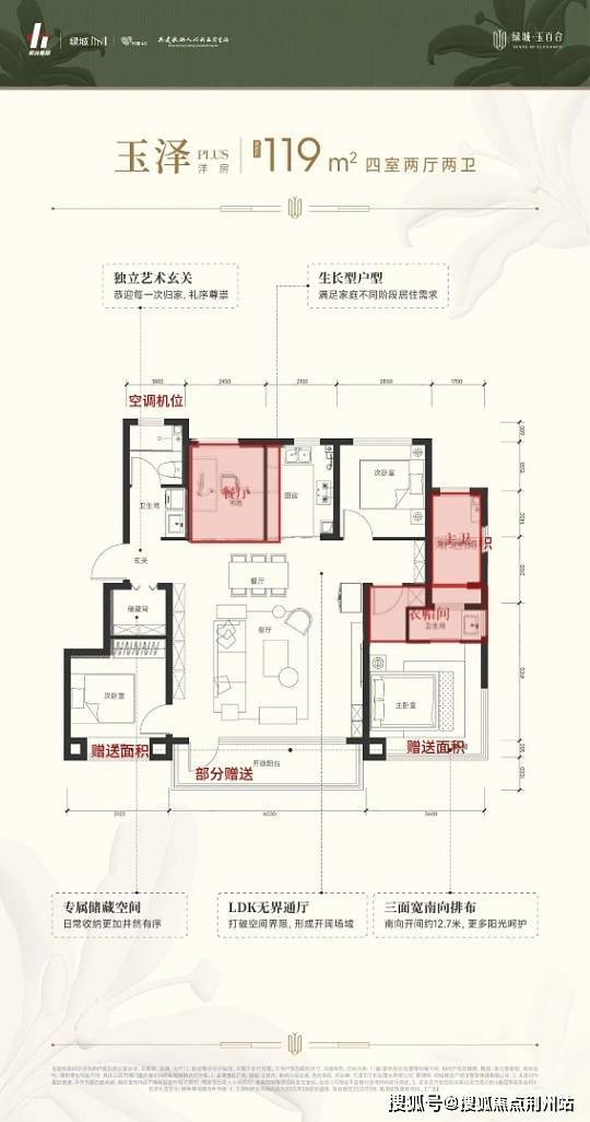 洋房户型注重空间灵活性,如119㎡户型可实现LDK一体化,预留自由改造空间,满足家庭不同阶段需求。