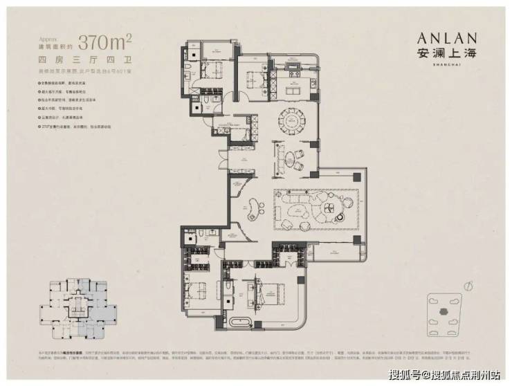 首先,不夸张的讲,建面约280㎡是我至今看过顶豪界最完美的四面宽全景舱户型。