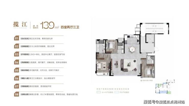 建面约139㎡:四室两厅三卫,南向面宽约15.2米,LDKG一体化布局,双南向套房,主卧约3.7米面宽,尊享双台盆,适配全周期家庭生活需求。