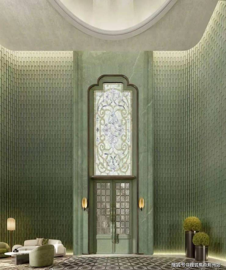 爱马仕绿奢石铺就了整面水纹墙。两扇对称的通顶大门,如天幕般悬垂而下,确立了空间秩序。