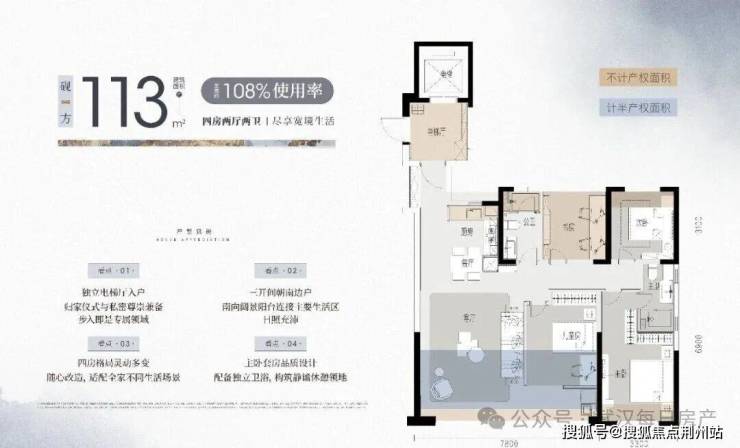 建面约113平:南北通透四房设计+独立电梯前室!优化后得房率约108%!