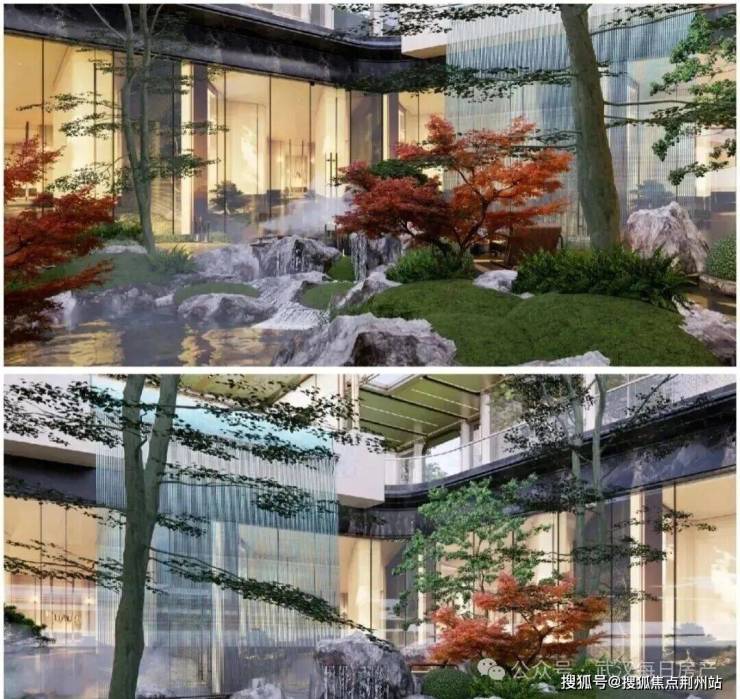 穿过入户大堂,是精致、细腻的下沉庭院,高低错落的叠水设计,让社区园林更显档次。