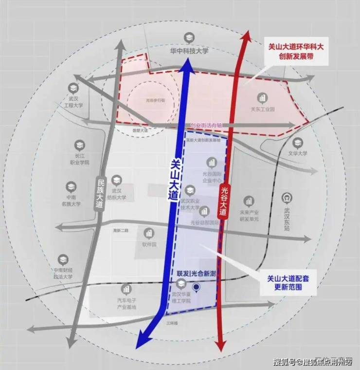 主轴纵横:两纵(关山大道、光谷大道)丨两横(关南园路、三环线)