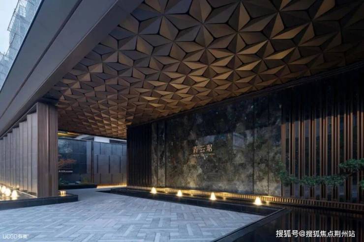色泽透亮的高定蓝翡翠奢石景墙,延续着弧形景墙,整体如一幅玉石骨扇缓缓展开,彰显青云威仪气场。顶部古铜色折形铝板,内嵌星光射灯,再现酒店式星级大堂尊感。落客大堂内,奢石的典雅质感、树影的光线灵动、以及暖色的氛围仪式,都展现了奢而不浮、谧而有悦的空间气质,展现迭新的精奢真意。