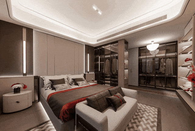 约16.7m南向四开间如同巨幅城市全景画框,约9.3m的环幕阳台揽尽一城的昼夜光影流转。中西双厨U型厨房与客餐厅无缝相连,从容备餐时,也可随时回应客厅间的谈笑。南向双套卧各主一方,筑起隐私屏障;主卧套房预留独立衣帽间位置、主卫五件套设计,于私密空间中复刻五星级酒店的尊崇动线。