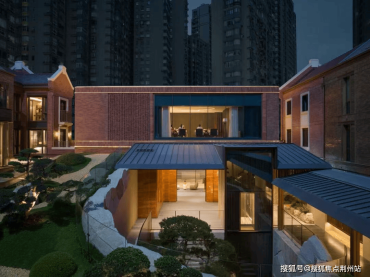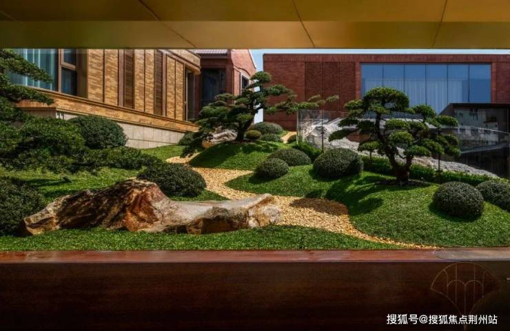 为了使我们在稀缺的地段营造稀缺的资源,把生活的想象现实化,越秀·外滩樾还在会所引“山水入园”。在空间有限的情况下,进行垂直空间的挖掘,营造了坡道景观、山水庭院和会所。