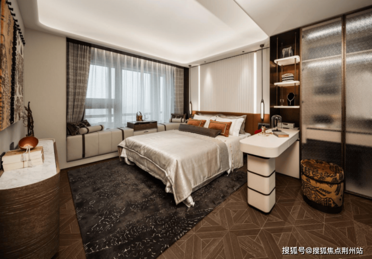 吊顶采用一体化大平顶加回型吊顶设计,并且在四个角均匀做了圆弧处理,让整个空间感更加和谐圆润。