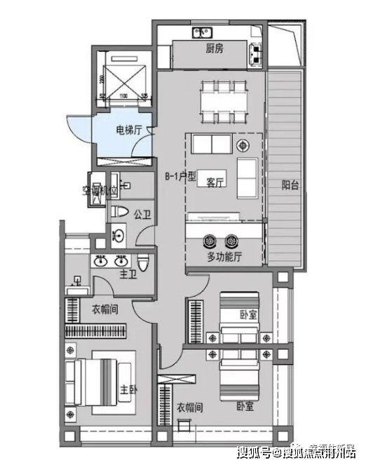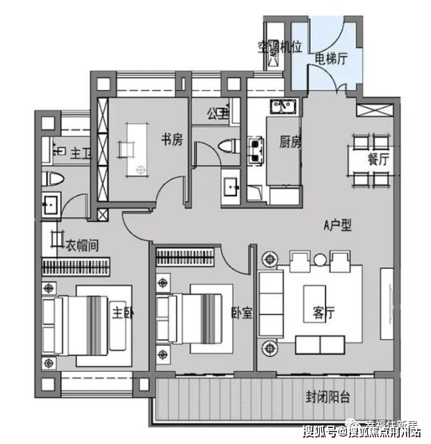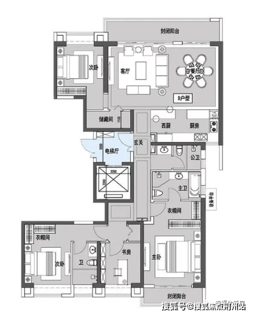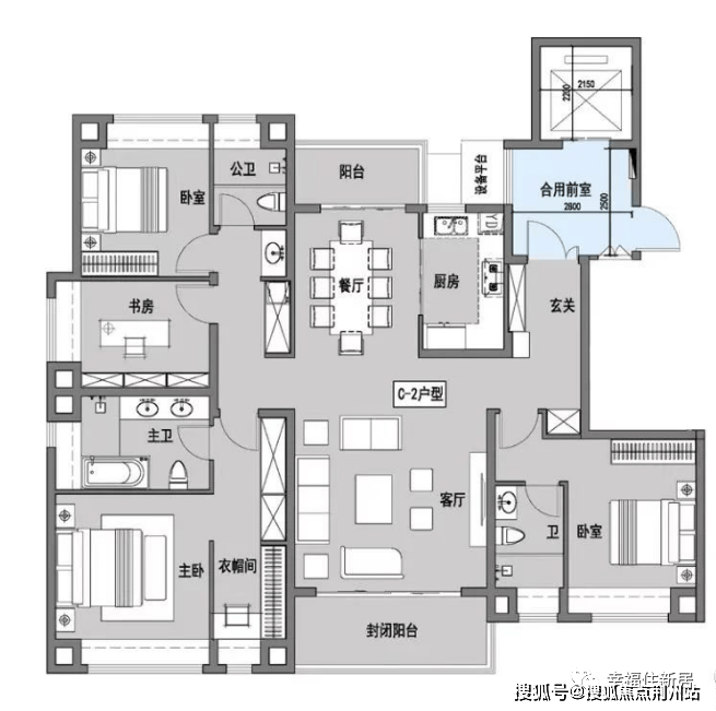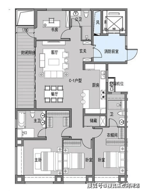 ·非常方正的四房户型,客厅朝西,且全房以客厅、餐厅、厨房为活动中心,北面有书房、公卫、南面是两个卧室和书房。