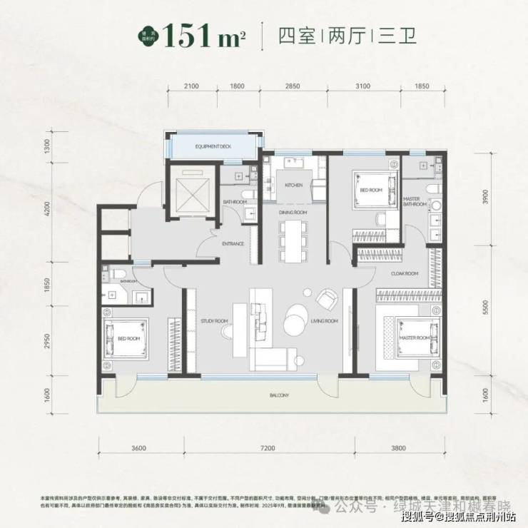 奢阔LDKB一体化:约7.2m 宽厅、餐厨与约14.6m 开敞阳台衔接,满足家庭互动需求;