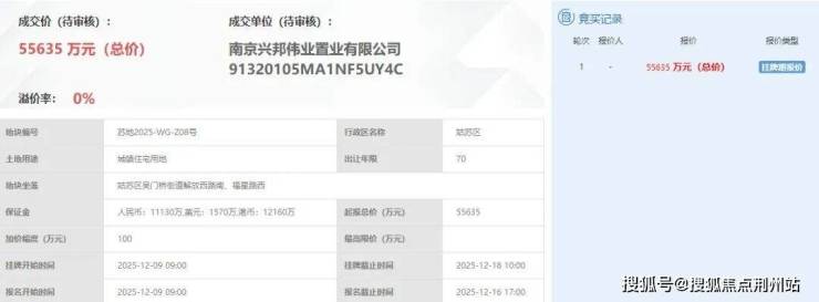 2025年12月,项目前身Z08地块由南京兴邦伟业底价竞得,成交总价5.5亿元,成交楼面价18000元/㎡。