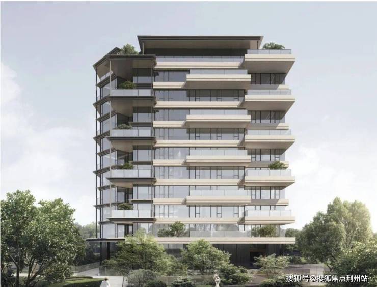 19号楼的1F四代洋房南立面效果图,就像一个玻璃盒子,带错层悬挑阳台和空中庭院,颜值相当能打。