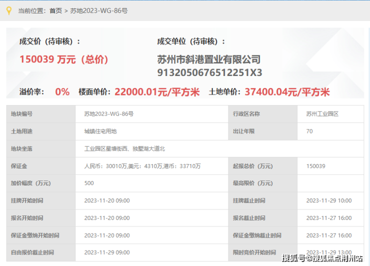 建屋·新棠玥,即斜港置业斜塘86号地块项目,即,苏地2023-WG-86号地块项目,位于工业园区星塘街西、独墅湖大道北,是2023年11月29日,斜港置业以底价150039万元竞得,成交楼面价22000元/平。