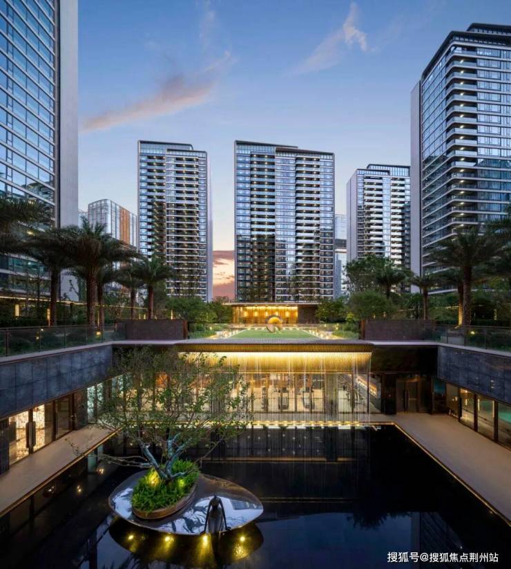 穿过大堂进入北区的中央庭院,可俯揽第二重院落,下沉式水院。这里也是我们花园环廊的起点,环廊联系着每栋楼座入口的前庭花园,则是第三重归家院落。