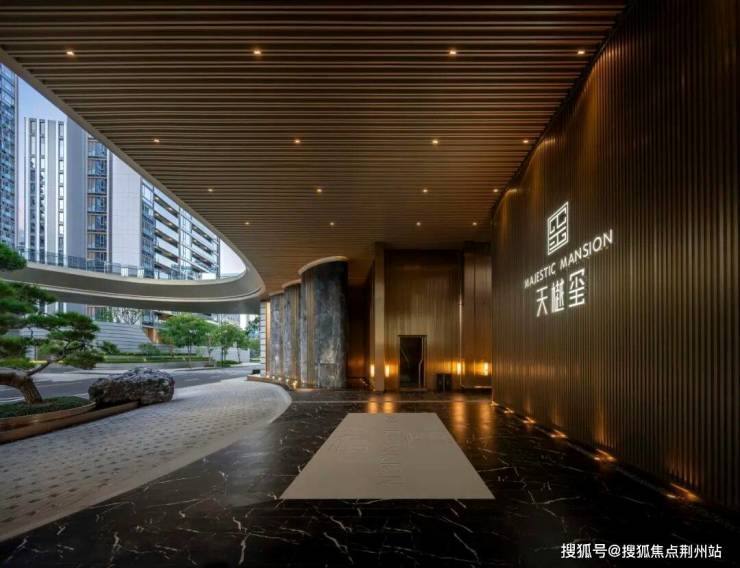 北区和南区的大门共同构成环抱式的空间格局。北区人行入口为一座宽60米,高6米的入户大门,迎面左右各布置3根直径4.2米的爱马仕灰奢石梭形柱,呈现出最高规格的归家仪式感。