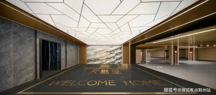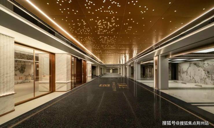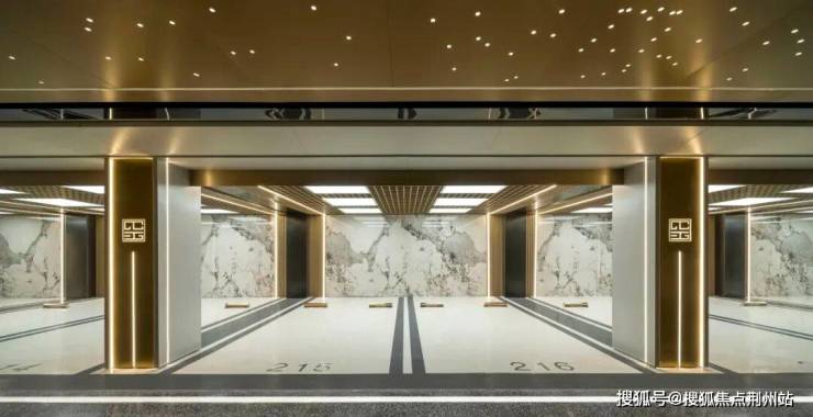 南北大门材质均以玉质奢石为表,金色照壁为里,这种材料搭配也延伸到了地下大堂空间,即考虑了“土生金”的五行原理,也包含了“金玉满堂”的寓意。