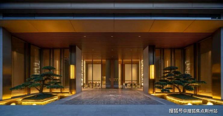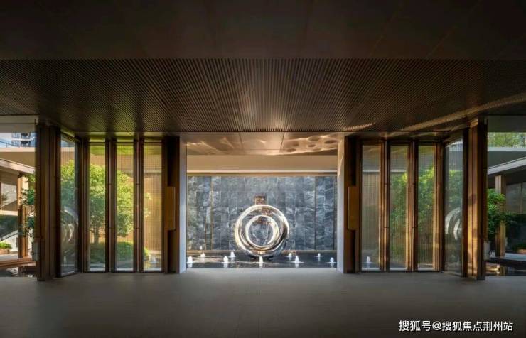 天樾玺的归家动线布置有三重院落层次,大门照壁之后的是第一进水院,从入口的恢宏尺度过渡到适宜的居住空间尺度,完成了从城市喧嚣到归家静谧的精神转译,水院联系着天樾玺标志性的宝格丽风格架空层社区大堂。