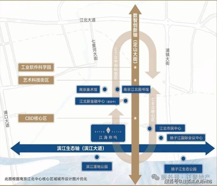 数智创新轴:江北新金融中心(建设中)、扬子江国际会议中心、江北市民中心、金融机构总部聚集区;