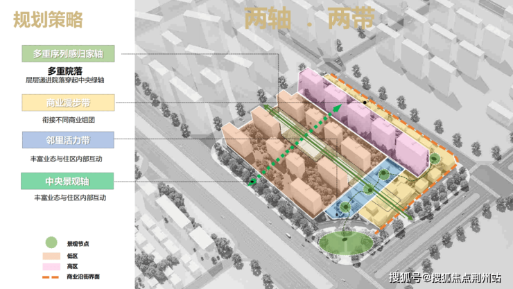 同时,内部景观规划为两轴两带格局,分别为多重序列感归家轴、商业漫步带、邻里活力带、中央景观轴。