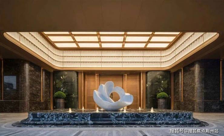 步入大门云石穹顶之下,匠心复刻古代“藻井”神韵,以522片皇家白玉精雕细琢,汇聚光华,辉映古今。华光流溢处,中心池水托举艺术雕塑,莹润皎洁,宛若稀世珍宝。立面更以铂金钻奢石铺陈,搭配墨绿荷塘月色奢石、安哥拉黑奢石花钵,以及手工锻造的巨幅铜门,于光影交错间流淌温润质感,尽显奢华风范。