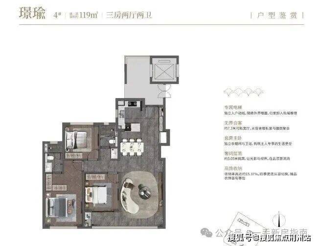 建面约119平房阔绰三房则是武昌内环核心即将入市楼盘中唯一的小面积四代户型,也是年底武昌核心大决战中上车门槛极具优势的房源,主打实用舒适,让你首次置业就有改善的尺度。
