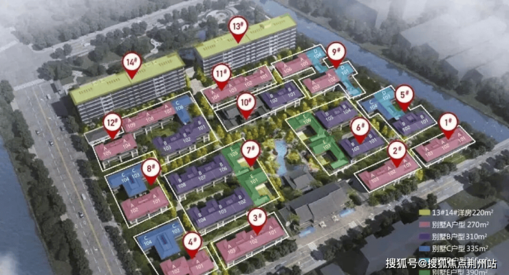 共14幢105户,合院联排12幢57套,洋房产品2幢48套,其中联排总高3层有270平(26套),310平(17套),合院335平(6套),365平(3套),390平(4套)最后一排是两幢总高7层(一楼架空)的洋房共48套。