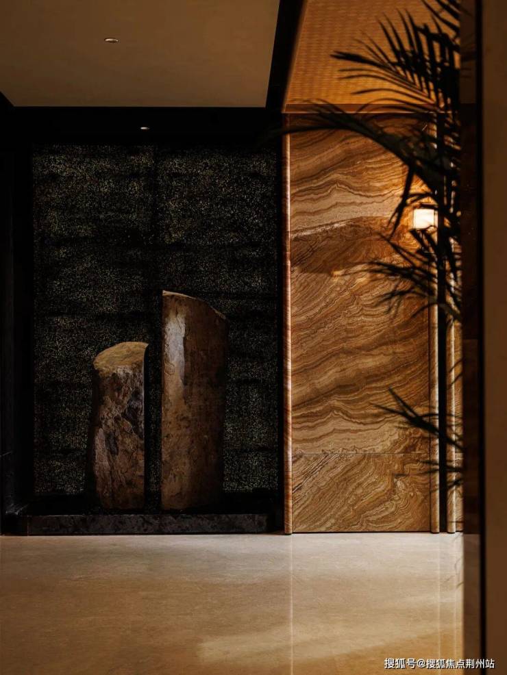 而金宁文华,堪称一部“石材使用教科书”。品类上,精选巴西进口印象山水奢石、浪淘沙天然石材、伊朗木纹玉奢石等近十种天然石材;工艺上,不见简单堆砌,反而处处是耗时、耗力、耗钱的手工细节——人工捶打的自然面、流畅的弧线处理、精巧的错拼艺术……共同诉说何为“高级的克制”。