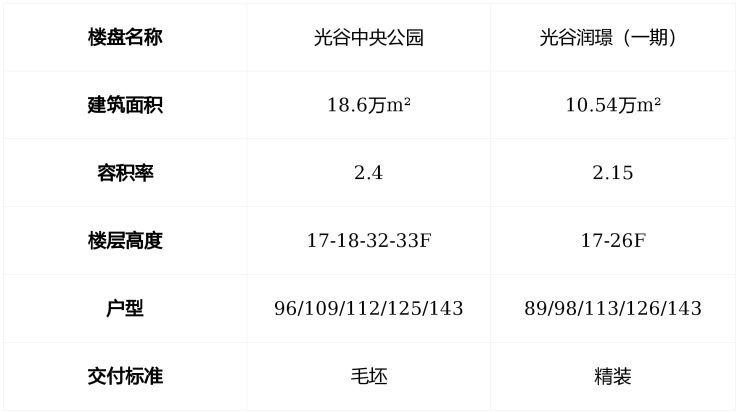 对比隔壁的光谷中央公园,可以发现面积段极为类似,只是往起步户型稍微更刚一点。