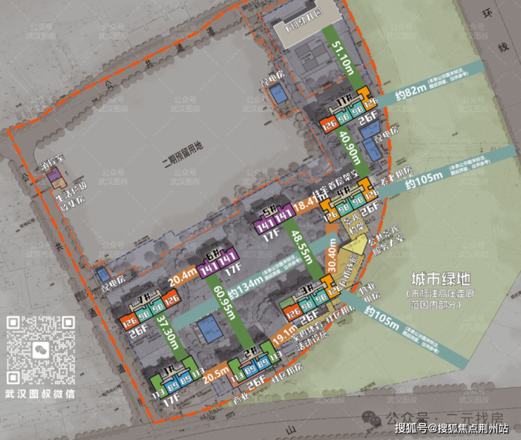 楼栋高度只有17F和26F,其中5号楼、6号楼是17F,两梯两户;其他楼栋均为26F,三梯四户。