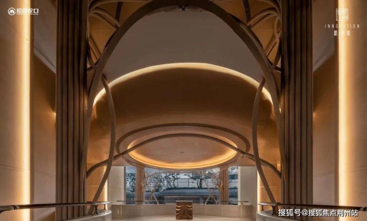 大门内外两重门厅景墙运用月光米黄石材近1000 方,搭配香槟金金属线条,汲取爱马仕全球旗舰店的双曲面叠墙造景手法,增加景墙奢华质感。