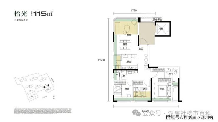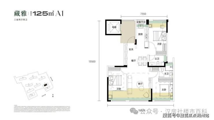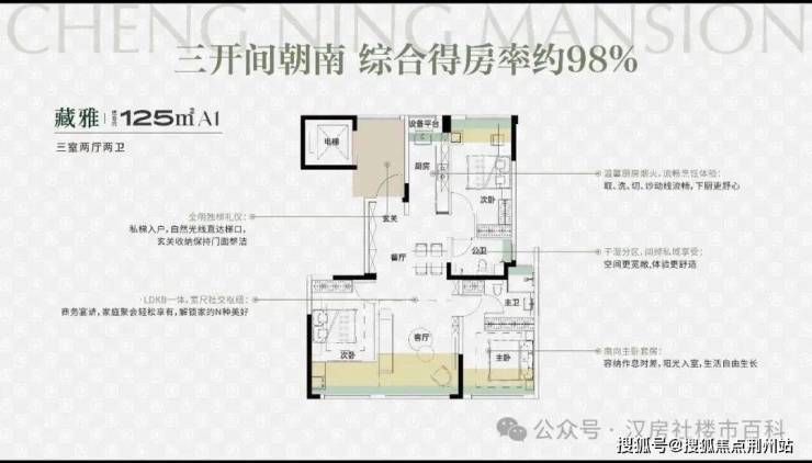 该户型位于1号楼的两端边户,3个卧室朝南,餐客厅一体全景舱设计,客厅为北、西(或东)两面采光,带独立电梯前室。三房设计满足家庭居住需求,双卫(公卫、主卧卫 )提升使用便利性,避免早晚洗漱等场景拥挤;厨房靠近入户,方便买菜归家后放置物品、处理食材;设设备平台,可灵活利用,如放置外机等,不占用室内空间。有玄关过渡空间,保障室内隐私,也可做收纳;卧室带一定收纳空间提升储物能力,让居住更整洁。