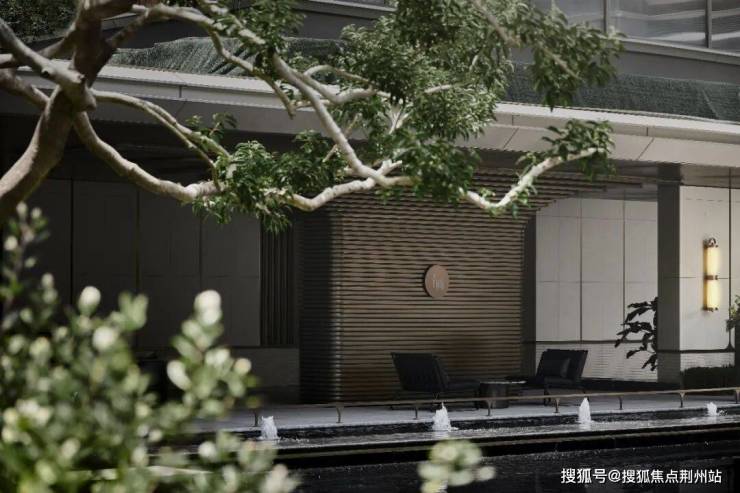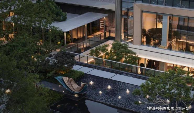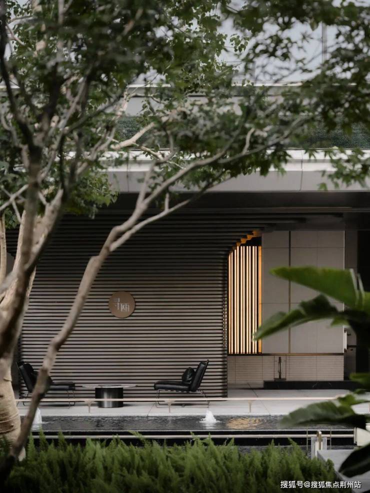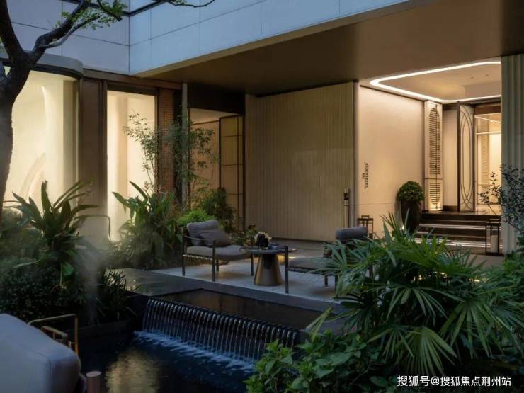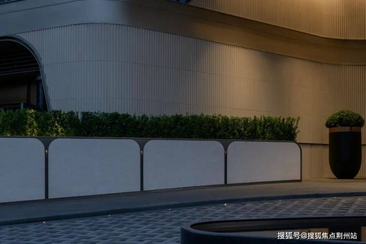优雅细腻的贝金米黄大理石镶嵌鎏金格栅背板,醒目且具有装饰性的LOGO标识,构成了入户景墙,叠水轻响中,特选造型铁冬青与景墙对景成诗。架空层通过水景基底, 铺装形式、植物种植来打破室内外的空间界限, 以无界空间美学,达内外无界交融。身处其中,对于空间的体验无限延伸,打破空间界限,营造人在景中、内外交融的整体氛围。