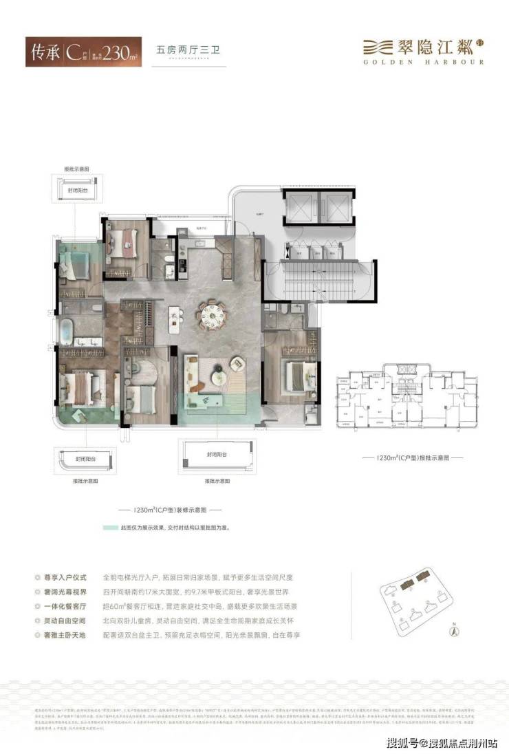 在杭州目前新房市场中,使用率能真正做到约90%的楼盘,凤毛麟角。翠隐江粼轩通过封闭阳台只算半面积+电梯厅空间转化(公区),实现使用率最大化。建筑面积约230㎡户型更是做到了近66㎡客餐厅+双套房布局,空间感媲美很多二手老豪宅的260㎡。