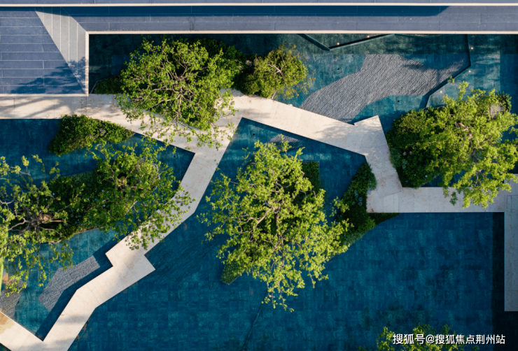 百米隐奢公园式入口:沿市政路退界约40米打造林荫大道,选用成年榉树阵列形成光影长廊。入口水景墙提取泉水意向,实现从城市喧嚣到社区静谧的无界过渡。