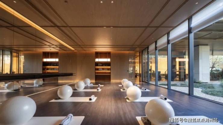 约1200㎡下沉式全能会所:仅设3大功能区,含瑜伽室、健身房、室内恒温泳池及室外戏水池,各空间尺度开阔。