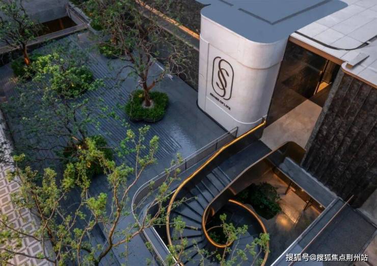 下沉式庭院,则位于生活馆与后场庭院之间,打造超7.5米的高差的抬地花园。运用三层叠水、四季花木、无边水池等多种造景手法,自然气息扑面而来。