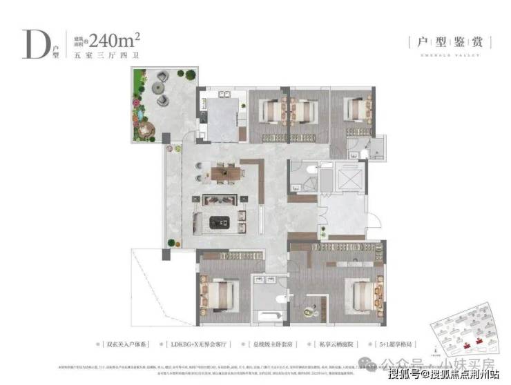 五室三厅四卫的设计,并且南向带双套房,北向一个套房加2个次卧,功能上更加灵活;