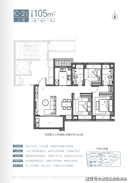 建面约105㎡3房2卫:项目建面约105㎡3房2卫有两种风格(宽厅、竖厅),尤其是宽厅户型,设计格外惊艳。