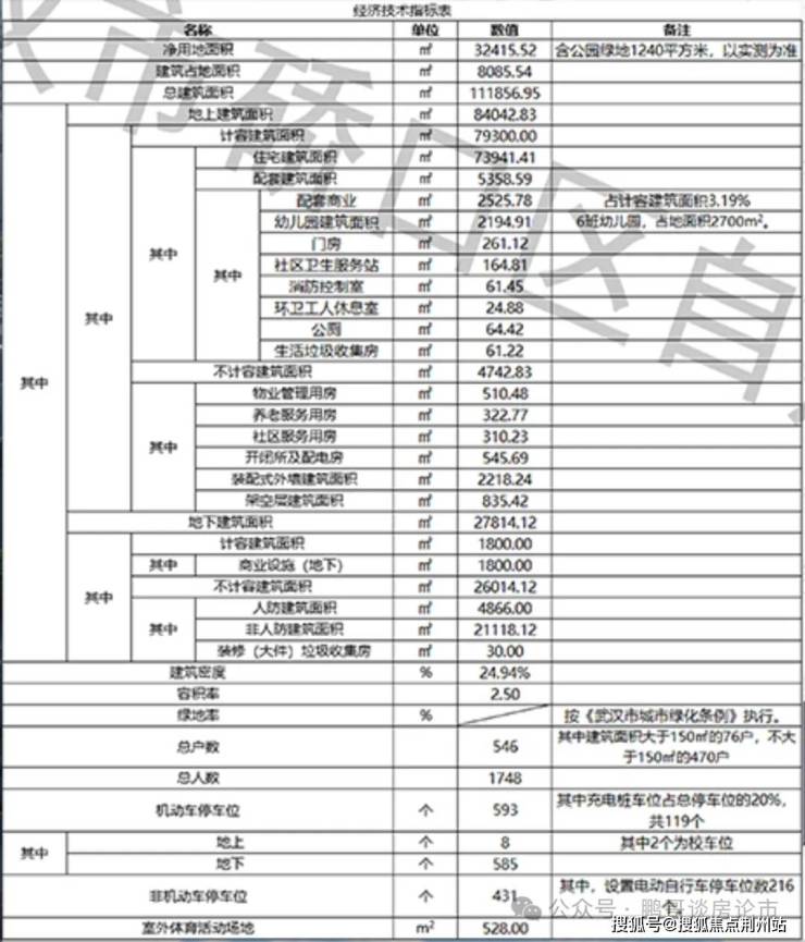 武汉城建·承宁府规划净用地面积32415.52㎡(含公园绿地1240㎡,以实测为准),建筑占地面积8085.54㎡,总建筑面积111856.95㎡。地上建筑面积84042.83㎡,计容建筑面积79300.00㎡,住宅建筑面积73941.41㎡,配套建筑面积5358.59㎡,配套商业2525.78㎡,幼儿园建筑面积2194.91㎡(6班幼儿园占地面积2700㎡),门房261.12㎡,社区卫生服务站164.81㎡,消防控制室61.45㎡,环卫工人休息室24.88㎡,公厕64.42㎡。不计容建筑面积4742.83㎡,物业管理用房510.48㎡,养老服务用房322.77㎡,社区服务用房310.23㎡,架空层建筑面积835.42㎡。地下建筑面积27814.12㎡,地下计容建筑面积1800.00㎡,地下商业设施1800.00㎡,地下不计容建筑面积26014.12㎡。建筑密度24.94%,容积率2.50,总户数546户,总人数1748人。机动车停车位593个(含充电桩车位119个),非机动车停车位431个。室外体育活动场地528.00㎡。