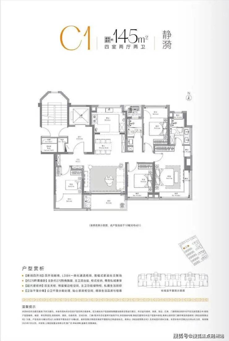 进门玄关步入式收纳空间,仪式感与实用性拉满。厨房、餐厅、客厅及阳台一体化设计,层高迭代至约 3.15 米。南北双阳台配置 +(边套)主卧约 270°转角飘窗。
