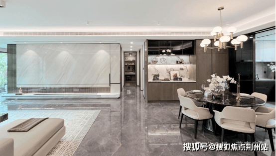 约43米奢贵门庭,百合花雕塑、200多片金色花瓣吊顶、莹莹生光的玉石大门,俯仰间皆瑰丽景致。挑空奢艺的归家大堂和地下光厅,天然石材铺贴,艺术审美延伸至归家每一步,材质与工艺彰显品味。