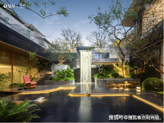 下沉庭院内,4颗丛生大乌桕围合,约5米高悬挑飞瀑灵动,搭配羽毛枫、镜面树池,营造度假酒店般的松弛与私密,归家仪式感与情绪价值拉满。
