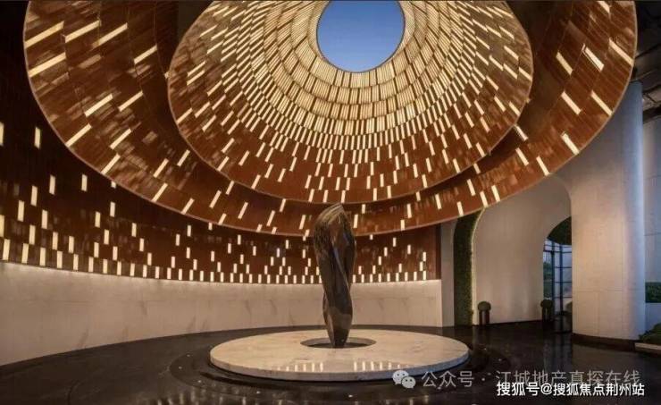 最吸引是大门左侧的人行主入口,以曾侯乙编钟三层悬挂于曲尺形钟架的形态为原型,通过11166片高定陶砖+透光石,纯手工拼接为三层叠级编钟造型曲面,将极具历史底蕴的演奏空间,变成归家主场,确实只需一眼,就能识别出金地大成乐府与众不同与匠心独运。