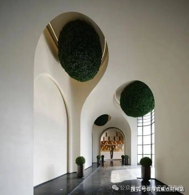 穿过人行入口,便是艺术感十足的穹顶连廊,走在这里如同进入了度假酒店,极其惬意。